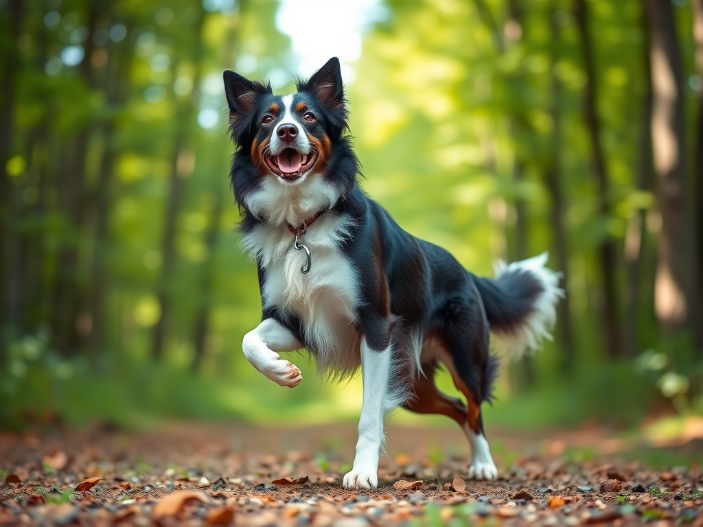 Kuva luotu tekoälyn avulla. Metsässä, sekä erilaisissa maastoissa liikkuminen tuo hyvää pohjaa koiran fysiikaan.