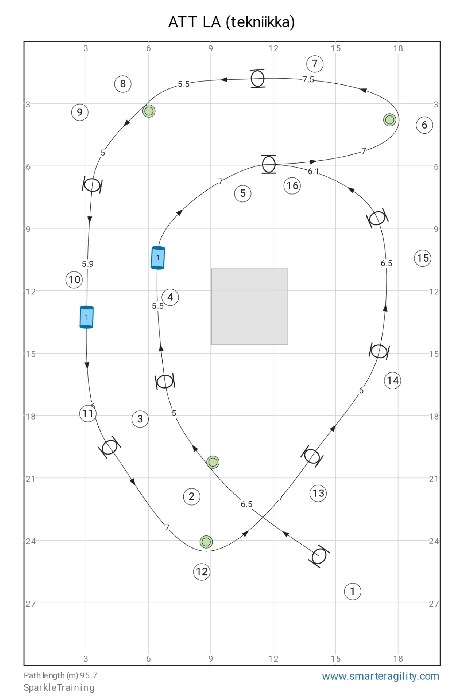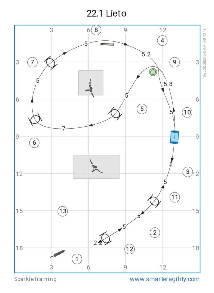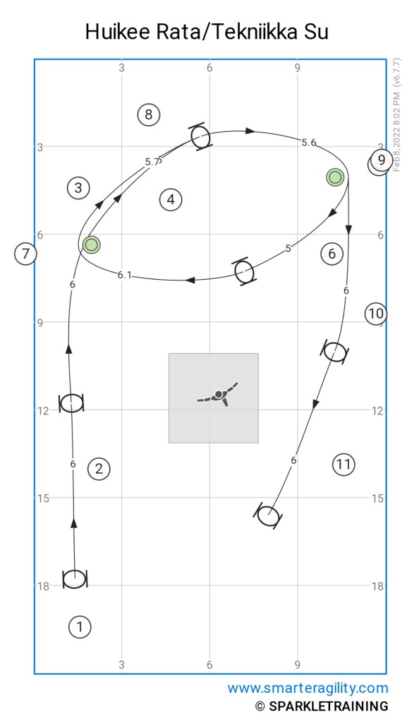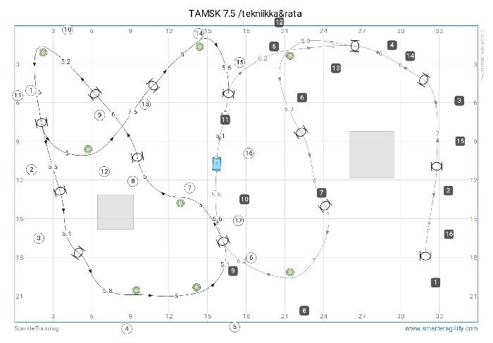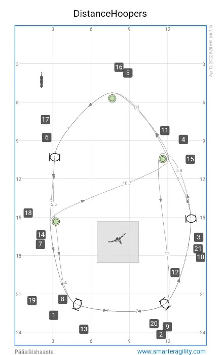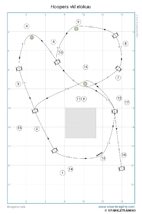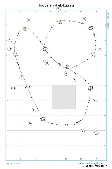 Kuten agilityn kisaradoilla, myös hoopersissa saadaan uusia haasteita vaihtamalla radan suuntaa.